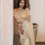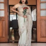 White pure organza saree with handprinted butterflies embellished with pearls and a pearl border.