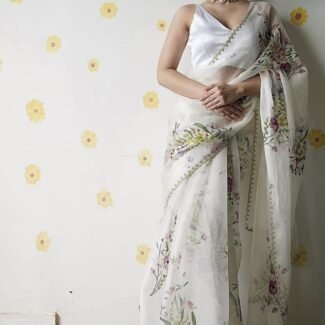 White pure organza saree with handprinted butterflies embellished with pearls and a pearl border.