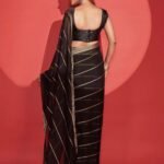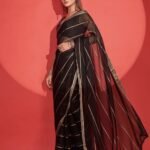 Steal the show in this Black & Gold striped ready-to-wear polyester saree.
